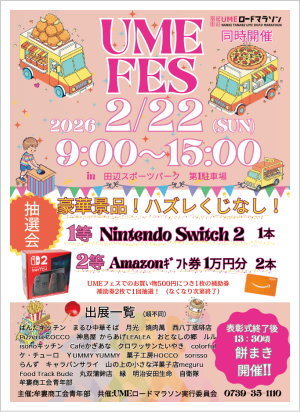 〒646-0001 和歌山県田辺市上秋津2084-1 (牟婁商工会内) TEL 0739-35-1110 FAX 0739-35-1112 E-mail info@ume-marathon.com
